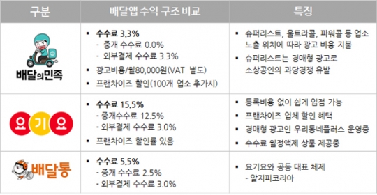 중개수수료는 배달앱 마다 다르다. 시장점유율 1위 배달앱인 배달의 민족은 가맹점주로부터 건당 외부결제 수수료 3.3%를 책정하고 기본광고비로 월 8만원을 받고 있다. 별도의 중개수수료는 없다. 반면 요기요는 주문한 건당 중개수수료 12.5%에 외부 결제수수료 3%를 더해 총 수수료는 15.5%를 받는다. 부가세까지 더하면 17.05%다. 배달통은 건당 중개수수료2.5%와 외부 결제수수료 3%를 책정하고 기본 광고비로 3~7만원을 받고 있다. 3대 배달앱의 총 수수료는 각각 3.3%, 16.46%, 6.6% 수준으로 1만원 매출에 최대 1700원의 수수료를 지불해야 하는 셈이다.