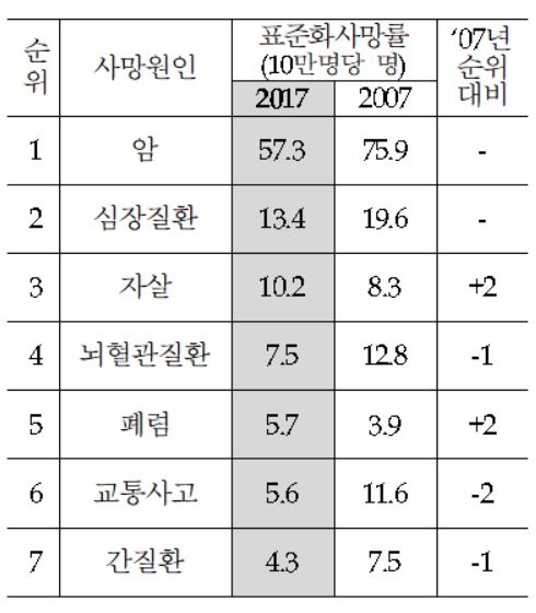 사망원인 중 자살은 2007년 8.3명에서 2017년 10.2명으로 상승하며 5위에서 3위로 크게 올랐다. 자살은 글로벌 금융위기로 경제지표가 악화된 2008년 이후 3년간 급격히 증가했다. 10만명 당 자살률은 지난 2008년 8.6명에서 2011년 13.2명으로 늘었다.
