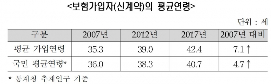 사망률 개선과 저출산 영향으로 신규로 보험에 가입하는 평균 연령은 2007년 35.3세에서 2017년 42.4세로 10년간 7.1세 늘었다. 이는 같은 기간 국민 평균연령 증가 폭 4.7세(36.0→40.7세)보다 크다.