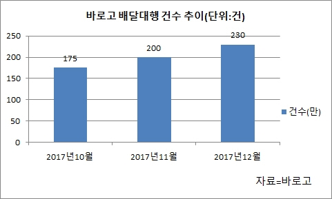 7일 관련업계에 따르면 '배달의민족'이 운영하는 자체 배달대행 서비스(배민라이더스)의 월 평균 주문량은 지난해 5월 기준 40만건으로 2016년에 비해 2배 정도 증가했다. O2O 배달대행 전문업체인 '바로고'의 거래액도 지난 2017년 기준 4500억원으로 라이더의 월 평균 배달대행 건수는 200만건을 기록했다. 지난 2016년 대비 73%나 급증한 셈이다. 배달대행업의 규모가 빠르게 성장하고 있다는 설명이다.