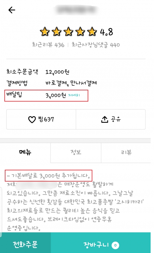 배달의 민족앱에 가입한 가게 중 한 곳이 배달료를 추가로 받고있다/나유리기자