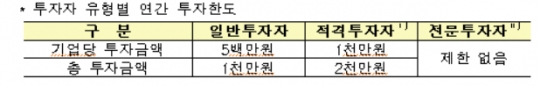 우선 금융위는 혁신적인 창업 벤처기업이 자금을 충분히 지원받을 수 있도록 크라우드 펀딩 관련 규제를 개선한다. 1년 동안 모집할 수 있는 금액은 15억원으로, 크라우드 펀딩 투자 경험이 많은 적격투자자를 중심으로 연간 투자 한도를 확대할 방침이다. 적격투자자 대상은 최근 2년간 총 5회 이상, 1500만원 이상 투자한 투자자다.