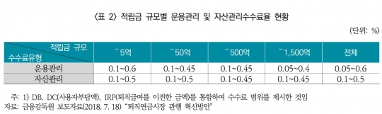 그러면서 "운영관리, 자산관리 등 통합적·획일적으로 수수료가 결정되기 때문에 가입자가 어떠한 서비스를 제공받고 있는지에 대한 이해도가 낮으므로 세부항목들의 특성을 반영해 수수료가 책정될 필요가 있다"고 밝혔다.