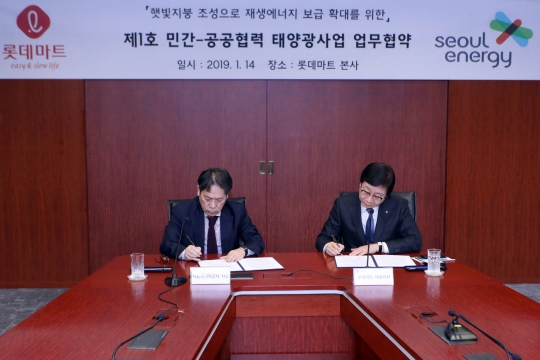 롯데마트는 14일 잠실 롯데마트 본사 7층 비전룸에서 서울에너지공사와 태양광 보급에 대한 양해각서를 체결하고, 롯데마트 옥상 주차장을 활용한 태양광 발전설비 신규 설치를 시행한다고 15일 밝혔다.