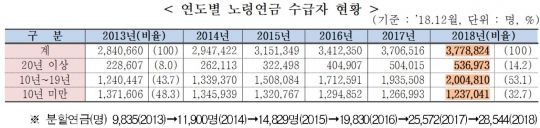 연금 수급자는 매년 큰 폭으로 증가하고 있다. 연금 수급자는 2003년 105만명에서 2007년 211만명, 2011년 302만명, 2017년 448만명, 2018년 460만명으로 증가세다.