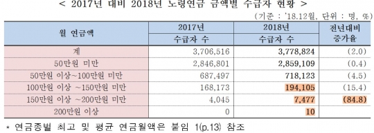 지난해 처음으로 노령연금을 월 200만원 이상 받는 사람이 10명 발생했다. 월 150만원 이상 200만원 미만 수급자는 7477명으로 84.8% 증가하고 월 100만원 이상 150만원 미만 수급자는 19만4105명으로 전년보다 15.4% 늘어나면서 월 100만원 이상 수급자는 20만1592명으로 처음으로 20만명대를 넘어섰다.