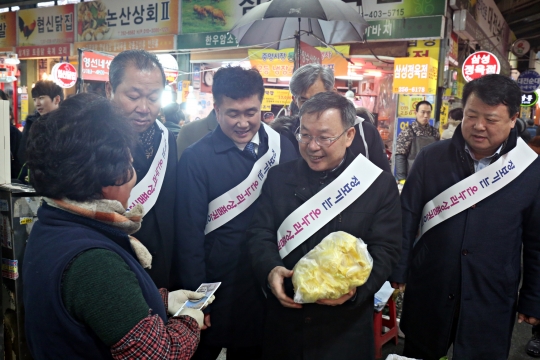 소상공인시장진흥공단은 지난 28일 대전 중구 중앙시장에서 '설 명절 전통시장 이용촉진 캠페인'을 했다. 소진공 이사장 직무대행 양희봉 부이사장(오른쪽 두번째)과 직원들이 상인과 이야기를 나누고 있다. /소진공