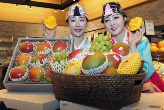 신세계백화점이 명절을 맞이해 이색적인 상품을 제안한다. 망고포도로 유명한 '샤인머스컷(15만원)', 추운 겨울에도 새콤, 달콤함을 맛볼 수 있는 페루산 '애플망고(10만원 / 15만원)', 완숙된 프리미엄 망고만을 엄선한 '태국망고(8만원)' 선물세트를 선보이는 것. 망고 특유의 높은 당도는 물론, 모양이 둥글고 예쁜 대과로만 구성한 프리미엄 망고 선물세트는 사과, 배 등 기존의 명절 선물세트 외에 이색적인 상품을 찾는 고객들의 눈길을 사로잡을 것으로 기대하고 있다. 당도 높고 향이 깊은 프리미엄 망고 선물세트는 신세계백화점 전 점의 과일 코너에서 만나볼 수 있다./신세계백화점