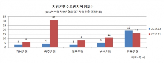지난해 11월, 제주은행을 제외한 지방은행 수도권 지역 점포는 총 72개로 지난 2014년 말(34개)에 비해 2배 이상 증가했다. 비대면 서비스 등에 어려움을 느껴 지점의 필요성을 느끼는 고령층은 지방에 더 많이 살고 있지만, 수요와 반대로 지점을 지방에서 더욱 찾기 어려운 구조가 된 셈이다.