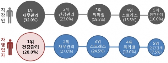'건강관리'는 2030세대 자영업자의 주요 불안요소로 나타났다. 직장인의 일상생활 불안요소 1위는 재무관리(32.0%)로 집계된 반면 자영업자는 건강관리(28.0%)를 가장 큰 불안 요소로 택했다.