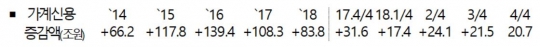 24일 한국은행의 '2018년 4분기 가계신용' 자료에 따르면 지난해 말 가계신용(가계대출+판매신용)은 1년 전보다 5.8% 늘어난 1534조6000억원으로 사상 최대치를 기록했다. 가계대출은 1444조5000억원, 판매신용은 90조2000억원이었다.