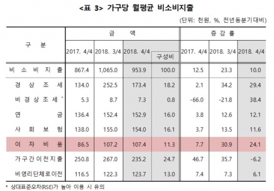 지난 2017년 4분기부터 소득의 개선에 비해 이자비용의 확대가 더 큰 폭으로 늘어나는 추세를 보였다.