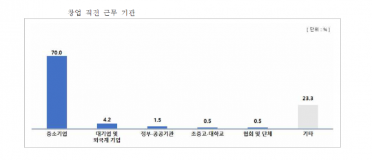통계청이 통계대행을 통해 집계한 이번 조사 결과에 따르면 창업 직전 근무처는 자영업자 등을 포함한 중소기업이 70%로 절대적이었다. 월급이 상대적으로 적은 중소기업에 다니다 노후 등을 걱정해 소상공인으로 창업해 생계를 이어가고 있는 사람이 10명 중 7명에 달하는 것이다.