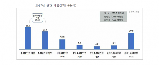 중기부 관계자는 "연간 매출액은 3600만원 미만이 28.5%, 3600만원 이상~7200만원 미만이 23.1%, 그리고 2억1600만원 이상이 20.9% 등에 각각 분포돼 있어 양극화가 심한 것으로 나타났다"고 설명했다.
