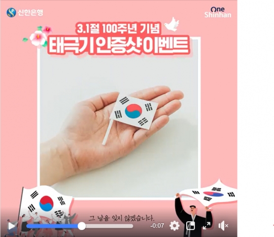 신한은행은 공식 페이스북 이벤트로 오는 3월 2일까지 태극기 인증샷 이벤트를 진행한다. 태극기 게양에 익숙치않은 젊은 세대가 각자의 개성을 담은 태극기 인증샷을 당행 페이스북에 인증하고 공유하도록 해 3·1운동의 의미를 기린다. 공식 포스트와 블로그에서는 삼일절 하루 전날인 오는 28일 미처 알려지지 못했던 3·1운동 열사를 선정해 소개하는 콘텐츠를 운영하며, 3·1절 당일에는 임시정부 100주년을 기념하는 콘텐츠를 게시함으로써 공유 이벤트도 추진할 예정이다.