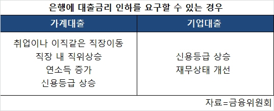 개정안에 따르면 가계대출의 경우 취업하거나 승진했을 때, 소득과 신용등급이 상승했을 때 금리인하를 요구할 수 있다. 기업 대출은 신용등급이 상승하거나 재무상태가 개선됐을 경우 가능하다. 또 고객이 금리 인하를 요구하면 은행은 의무적으로 10영업일 이내 수용 여부나 거절 사유를 유선, SMS 등으로 통보해야 한다.