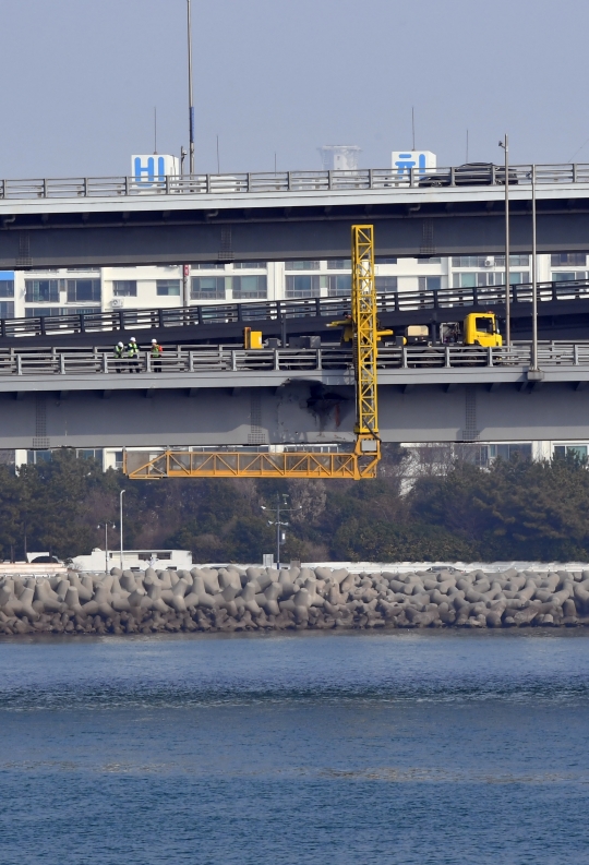 지난 1일 부산 광안대교 하판에서 부산시설공단 관계자들이 러시아 화물선 충돌로 파손된 시설물에 대한 안전점검 등을 하고 있다.(사진=뉴시스)