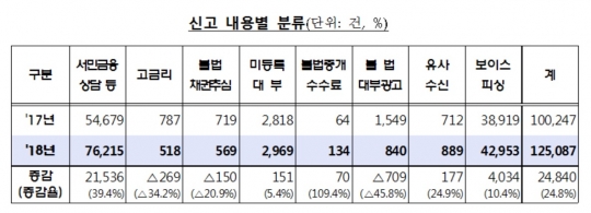 신고 내용별 비중은 서민금융 상담이 7만6215건(60.9%)으로 가장 많았고 ▲보이스피싱 사기가 4만2953건(34.3%) ▲미등록대부 2969건(2.4%) 등의 순이다.