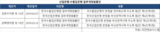 13일 금융권과 정치권에 따르면 김광수 의원(전주 갑)과 김해영 의원(부산 연제구)은 각각 전북과 부산으로 산업은행과 수출입은행 본점을 이전하는 일부 개정 법안을 발의했다. 본점을 서울특별시에 둔다는 산업은행법과 수출입은행법을 개정해 금융중심지로 지정된 부산이나 금융중심지로 논의되고 있는 전북으로 이전하겠다는 설명이다.