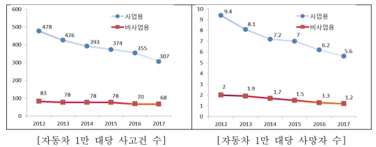 자동차 1만대당 사고건수 및 사망자 수. /삼성교통안전문화연구소