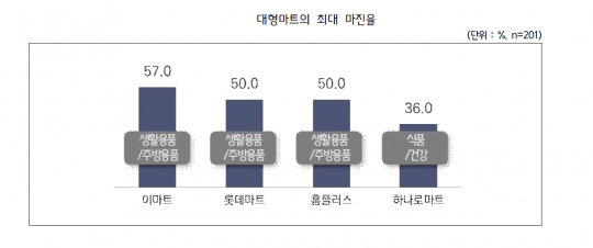 특히 생활·주방용품의 경우 이마트(57%), 롯데마트(50%), 홈플러스(50%)가 무려 50% 이상의 수수료를 받고 있는 것으로 파악됐다.