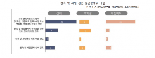 백화점과 대형마트의 불공정거래는 전반적으로 줄었지만 할인행사 등에선 유통업체보단 관련 할인비용이 주로 납품 중소기업들에게 고스란히 전가되고 있는 것으로 조사됐다.