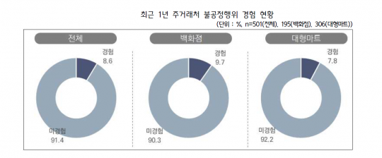 또 최근 1년간 불공정거래행위를 경험한 경우는 백화점 납품 중소기업은 9.7%(19곳), 대형마트 납품 중소기업은 7.8%(24곳)에 각각 달했다.