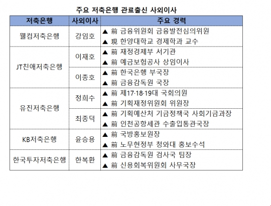 17일 저축은행 업계에 따르면 웰컴·JT친애·유진저축은행 등 주요 저축은행 이사회의 과반수를 차지하는 사외이사 중 관료 출신 이력을 가진 이들이 곳곳에서 눈에 띄고 있다.