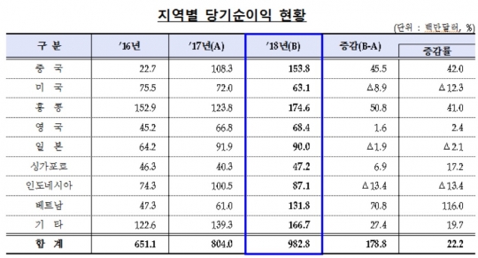 지역별로는 홍콩이 1억7500만 달러로 순이익이 가장 컸고, 중국과 베트남이 각각 1억5400만 달러, 1억3200만 달러로 집계됐다.