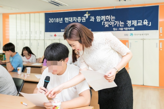 2018년 8월 8일, 현대차증권 임직원들이 찾아가는 경제교육 사회공헌 활동을 하고 있다./사진=현대차증권