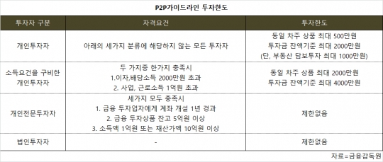 현재 P2P가이드라인에 따르면 한 중개업체당 개인신용을 비롯한 비부동산 P2P상품에는 2000만원, 부동산 P2P상품에는 1000만원까지 투자할 수 있다. 또 한 상품당 투자 한도는 500만원으로 제한된다.