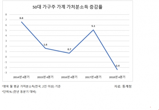 지난해 4분기 50대가 가구주인 가계의 명목 월평균 가처분소득(전국·2인 이상)은 412만원으로 1년 전보다 19만2000원(2.4%)이 줄었다. 글로벌 금융위기 당시인 2009년 2분기(-2.9%) 이후 최대 낙폭이다.