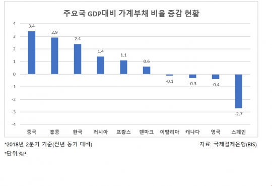 주요국 GDP대비 가계부채 비율 증감 현황./국제결제은행(BIS)