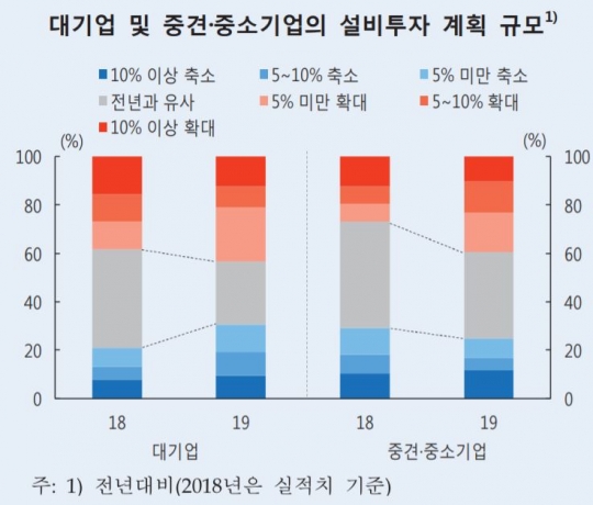 중견·중소기업의 경우 투자확대를 계획 중인 업체의 비중이 지난해 27.0%에서 올해 39.4%로 상당폭 상승한 반면 축소 예정인 업체는 29.2%에서 24.8%로 소폭 줄었다. 대기업은 투자 확대, 축소를 답한 업체가 모두 증가했다. 투자를 확대하겠다고 답한 대기업 중 '5% 미만 확대' 비중은 대폭 상승한 반면 '10% 이상 확대' 비중은 하락했다. 수출 비중이 큰 대기업들은 올해 대내외 불확실성 확대에 투자를 보수적으로 전환한 것으로 풀이된다.