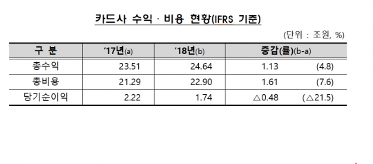 한편 카드사가 발표하는 국제회계기준(IFRS)에 따르면 지난해 카드사의 당기순이익은 전년 대비 21.5% 감소했다. 지난해 IFRS에 의한 카드사의 당기순이익은 1조7000억원으로 전년 2조2000억원에 대비해 4772억원이 줄었다.