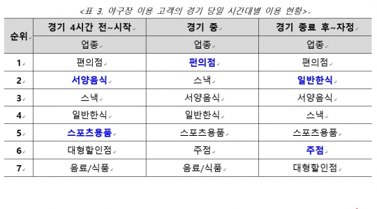 야구 경기가 있는 날에는 편의점 이용률이 가장 높은 것으로 나타났다. 경기 시작 전에는 피자·햄버거와 같이 경기 관람 시 즐길 수 있는 먹거리 위주의 소비가 높았으며, 식·음료를 제외하면 구단 유니폼과 야구용품을 판매하는 팀 스토어 등 스포츠용품 판매업종의 이용 비율이 높았다. 경기 후에는 주로 고깃집 등 일반 한식과 주점에서의 소비가 가장 높았다.