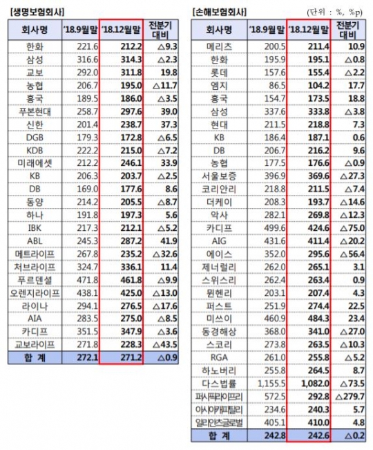 금융감독원이 15일 발표한 '2018년 12월 말 기준 보험회사 RBC비율 현황'에 따르면 4분기 보험사들의 RBC비율은 261.2%로 3분기(261.9%) 대비 0.7%포인트 하락했다.