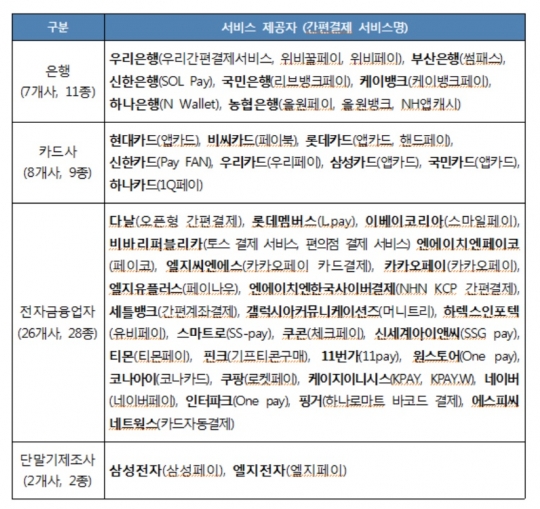 현재 간편결제는 은행·카드사·전자금융업자 중 총 43개사가 50종의 서비스를 제공 중이다. 업권별로는 네이버·카카오페이 등 전자금융업자의 가입자수가 1억1300만명으로 가장 많았으며 ▲카드사 3300만명 ▲단말기 제조사 1600만명 ▲은행 800만명 등의 순이다.