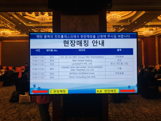 미리 신청하지 않은 기업도 현장에서 매칭 미팅을 할 수 있다. 바이어 부스 앞에 설치된 모니터에 시간이 빈 기업을 확인한 뒤 현장에서 신청하면 된다. 2017년 말 회사를 연 김기훈 코스마이징 대표이사도 이런 방식으로 싱가포르와 중국에서 온 바이어와 만났다.