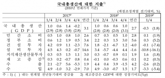 성장률이 마이너스로 전환한 것은 2017년 4분기(-0.2%) 이후 5분기 만이다. 성장률 -0.3%는 2008년 4분기(-3.3%) 이후 41분기 만에 최저치다. 글로벌 금융위기 이후 10년여 만에 가장 낮은 경제성장률을 기록한 것이다.