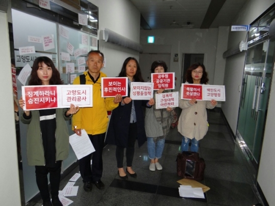 고양도시관리공사 사장실 앞에서 고양여성시민사회단체 회원들이 인사문제와 관련해 철회를 주장하며 피켓시위중/메트로미디어