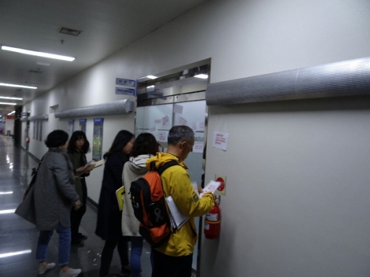 고양여성시민사회단체 회원들이 고양도시관리공사 사장실 문과 벽에 항의성구호를 붙이고 있다./메트로미디어