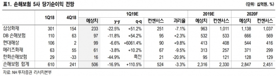 삼성화재, DB손해보험, 현대해상, 메리츠화재, 한화손해보험 등 손보사 5곳의 1분기 순이익은 컨센서스는 5240억원으로 전년 대비 14.0% 줄어들 전망이다.