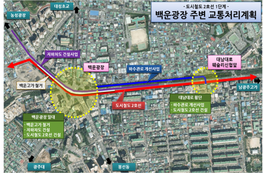 백운광장의 경우 고가 철거 시 교통혼잡이 우려되므로 충분한 논의를 거쳐 백운고가 철거와 지하차도 및 2호선 건설은 세계수영선수권대회 등을 종합 고려하여 단계별로 상호 병행 추진하기로 했다.