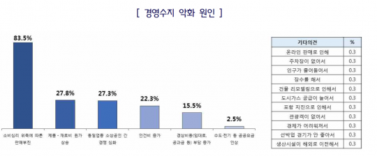 경영수지가 악화된 원인으로는 '소비심리 위축에 따른 판매부진'이 83.5%로 1순위를 차지했다. 이외에 '제품·재료비 원가상승'(27.8%), '동일업종 소상공인 간 경쟁심화'(27.3%) 등의 순이었다.