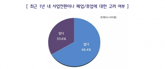 이런 가운데 최근 1년새 휴업이나 폐업을 고려한 소상공인은 33.6%에 달했다. 매출액이 적을 수록 폐업을 생각한 경우가 많았다.