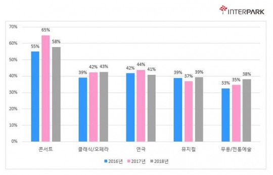 1인 관객 예매의 비중이 가장 높은 장르는 콘서트로 ▲2016년 55%, ▲2017년 65%, ▲2018년 58%로 나타났다. 이는 아이돌 가수들의 콘서트 예매 경쟁이 치열해지면서 아이디당 1매로 티켓 매수를 제한하는 경우가 증가하고 있어 제도적인 영향도 있는 것으로 분석된다.