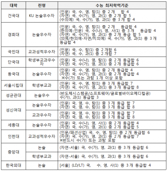 올해부터 수시 학생부교과전형에 수능 최저학력기준을 적용하는 국민대의 경우 인문계열은 국, 수, 탐(1과목) 중 2개 합 6이고, 자연계열은 국, 수, 과(1) 중 2개 합 7을 적용한다.