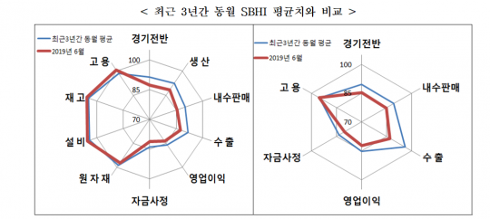 올해 6월의 SBHI와 최근 3년간 같은 달의 항목별 SBHI 평균치와 비교해도 침체가 눈에 띈다. 제조업의 경우 경기전반, 생산, 내수판매, 수출, 영업이익 전망 및 역계열인 설비·재고·고용 전망이, 비제조업은 경기전반, 내수판매, 수출, 영업이익, 자금사정, 고용전망에서 모두 악화됐다.