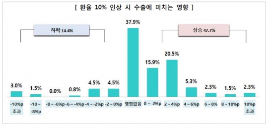 환율 상승의 수출 개선 효과도 기대 이하였다. 환율 10% 상승 시 수출이 '늘어난다'고 응답한 기업은 47.7%, '영향 없다'고 응답한 기업은 37.9%로, 수출 개선 폭은 1.0%포인트로 미미했다.